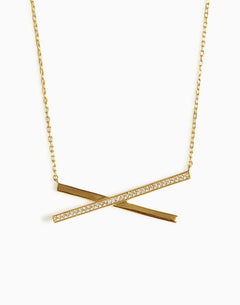 Two bars of beautiful gold have collided – one solid and sleekly finished, the other coated in a row of shimmering crystal stones. Throw a delicate chain into the mix, and you have a necklace with a modern yet very feminine silhouette.
