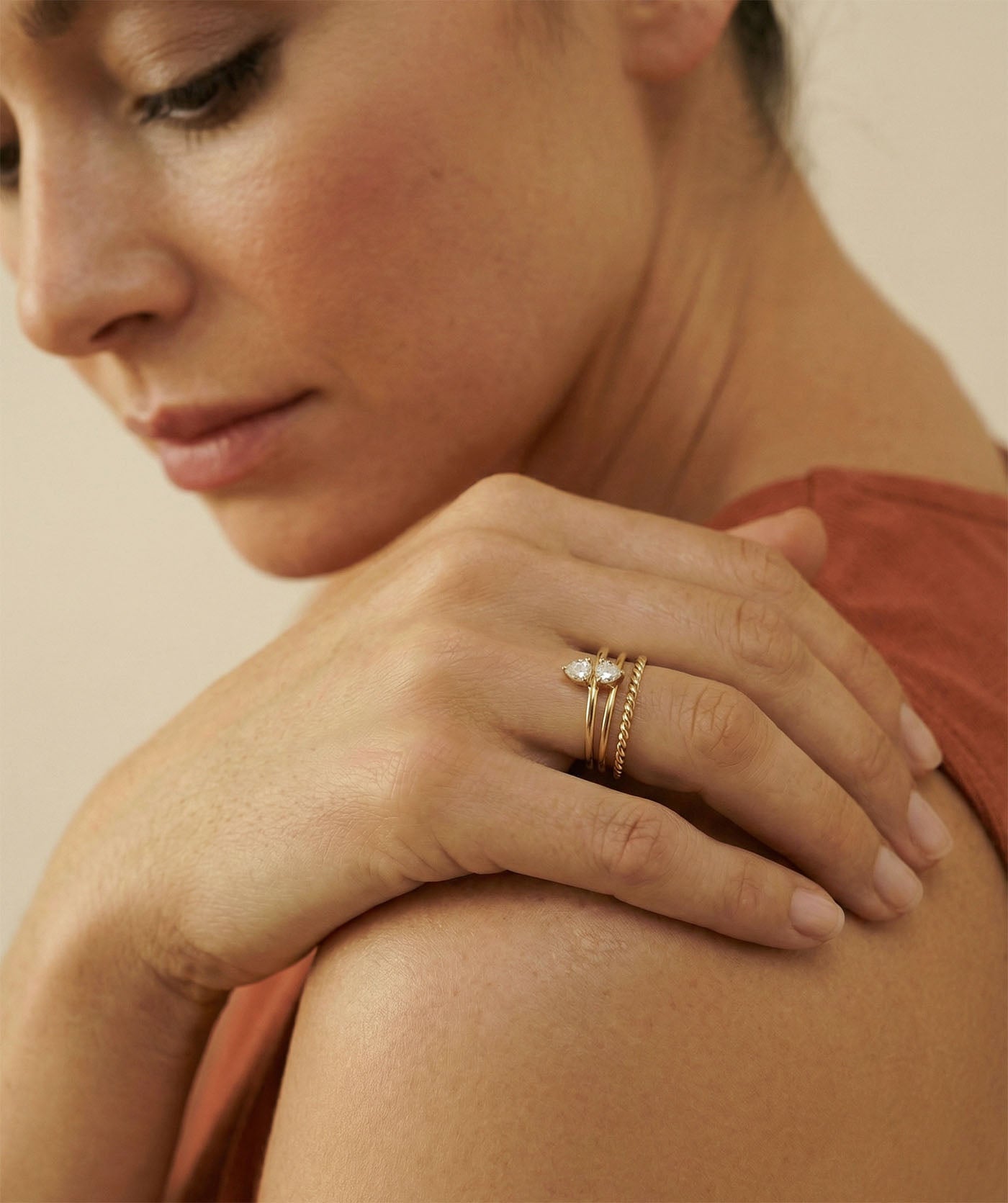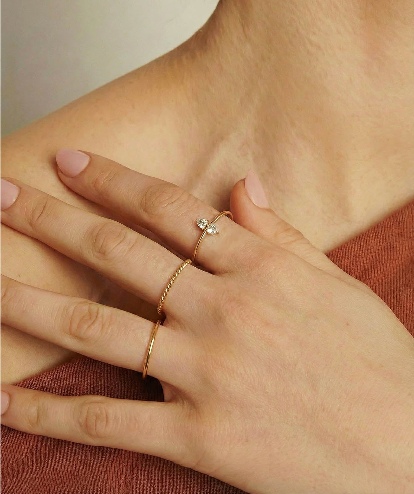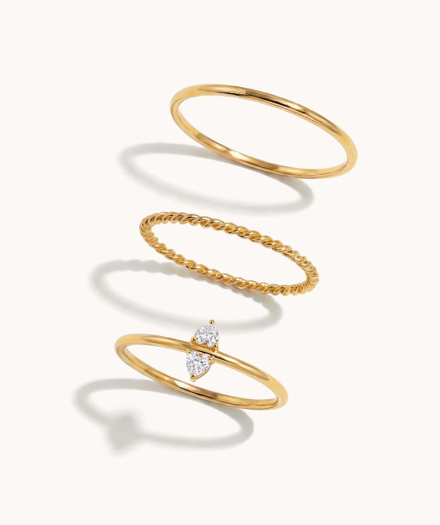 A refined trio for everyday elegance: a mirror-smooth band, a delicate rope twist for texture, and a heart duo for subtle sparkle. Minimal, modern, perfectly balanced—wear stacked or solo.