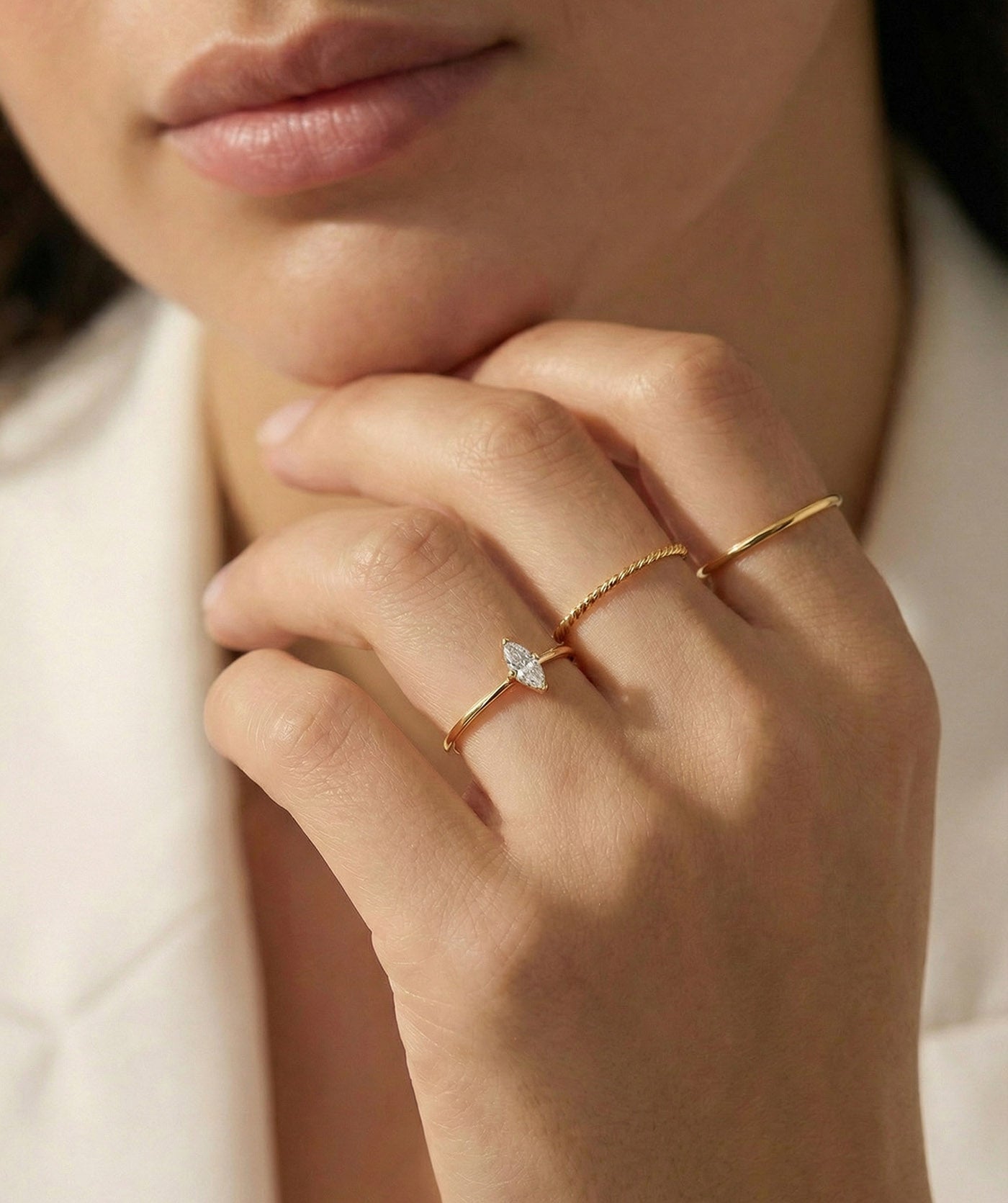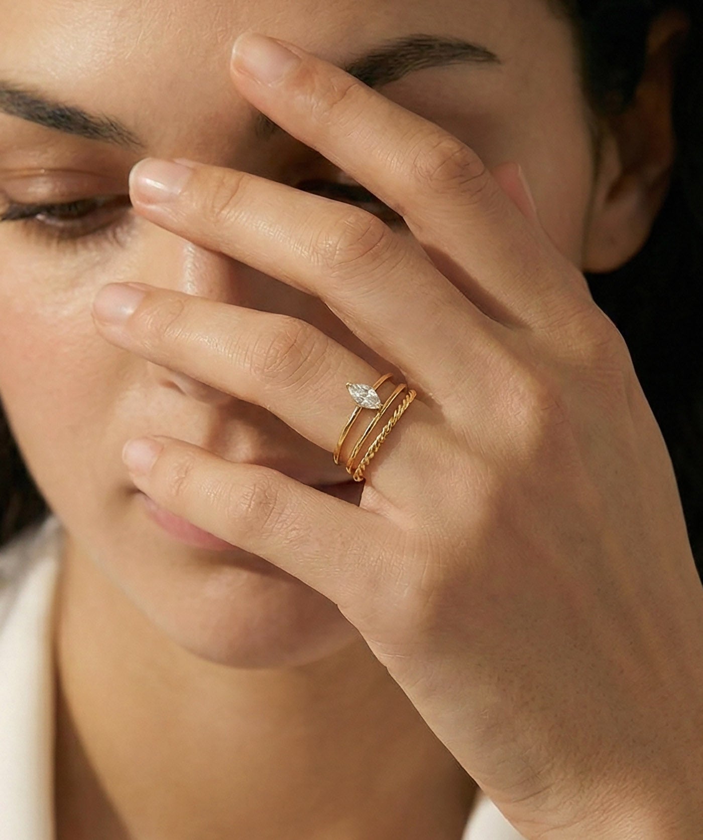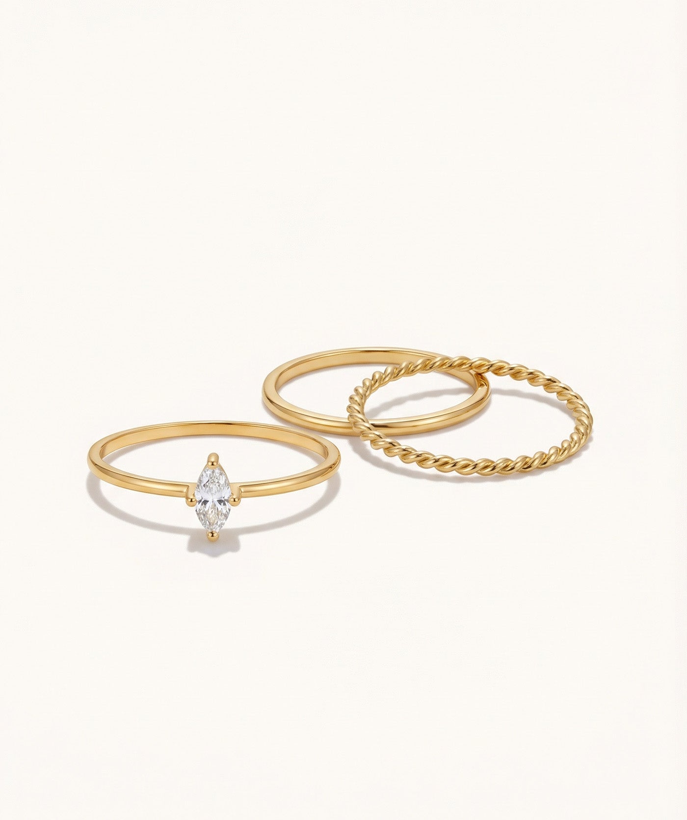 A minimal stack with a touch more brilliance. This trio pairs a sleek band and rope twist, finished with a marquise sparkle—symmetrical, delicate, and eye-catching without feeling bold. Modern, refined, and made for everyday. Wear stacked or solo.