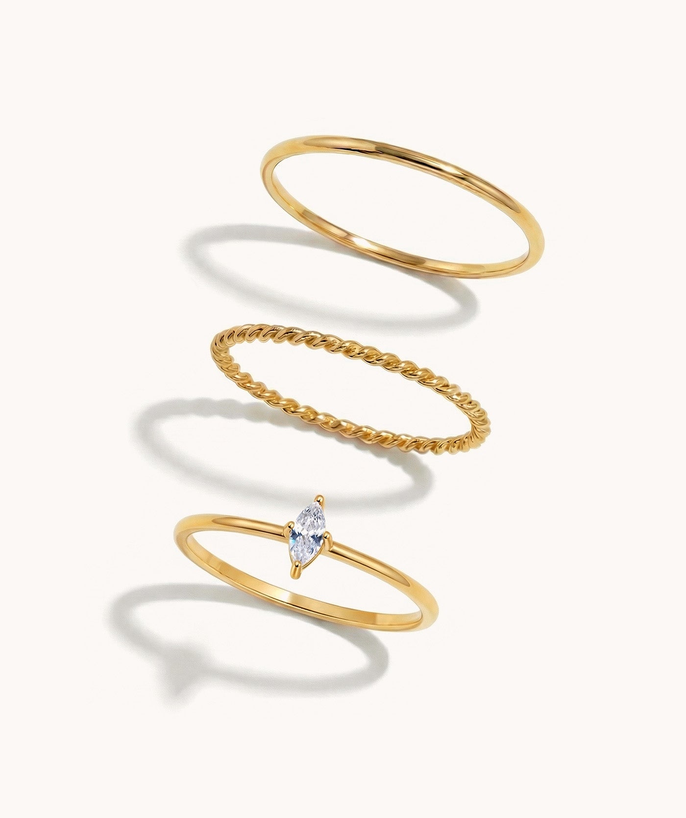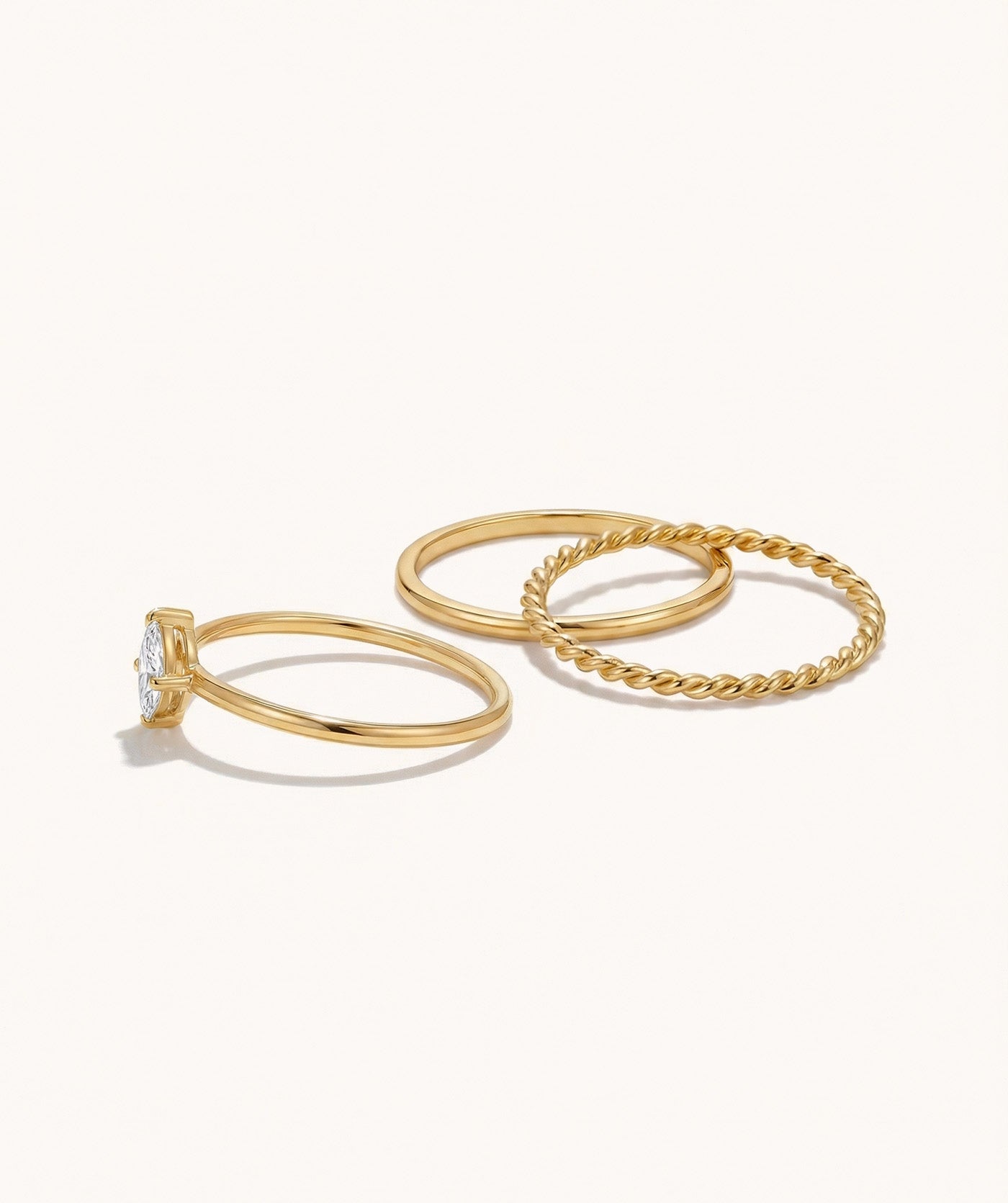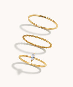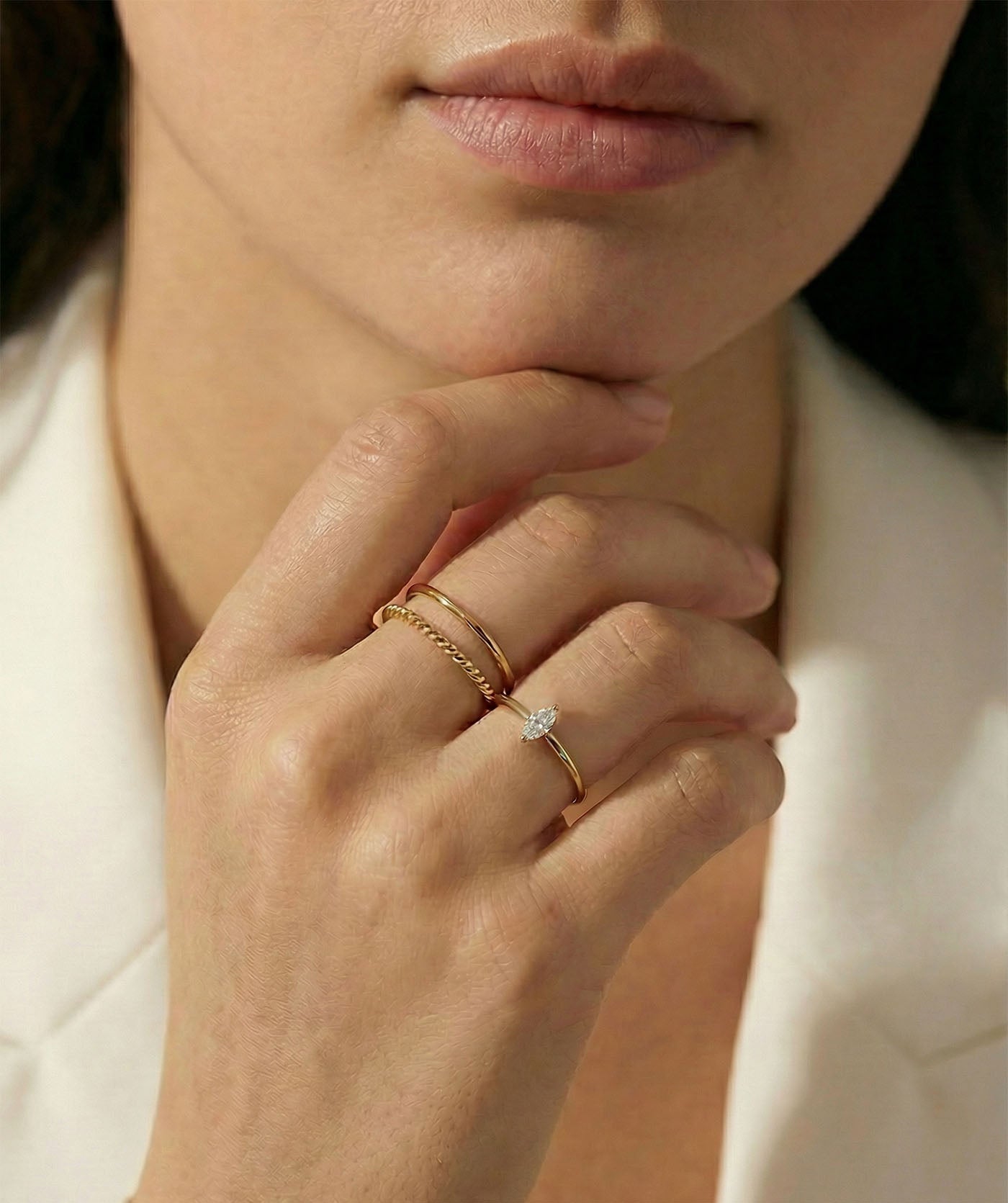 A minimal stack with a touch more brilliance. This trio pairs a sleek band and rope twist, finished with a marquise sparkle—symmetrical, delicate, and eye-catching without feeling bold. Modern, refined, and made for everyday. Wear stacked or solo.