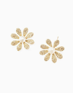 Each pearl earring is formed as a centerpiece for eight cubic zirconia crystallized petals—flashing out pell-mell in an exciting floral pattern. The earrings are studded, holding as much personality as any jangling pair.