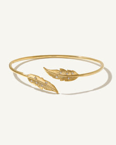 A simplistic slice of gold wafts into detailed, gleaming gold feathers. The feathers tip in the subtle breeze and their fine lines are stunning portraits of organic, natural elements.
