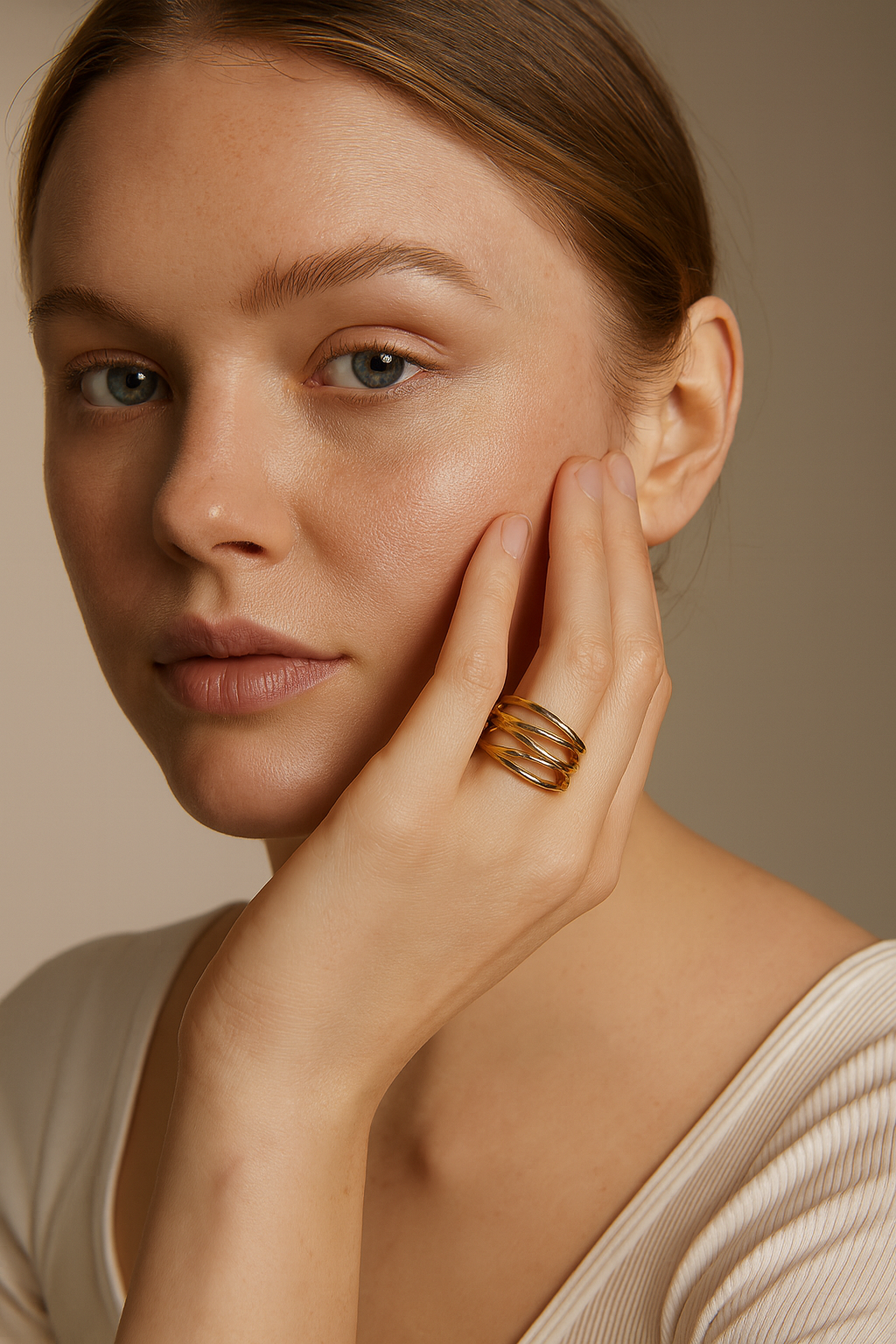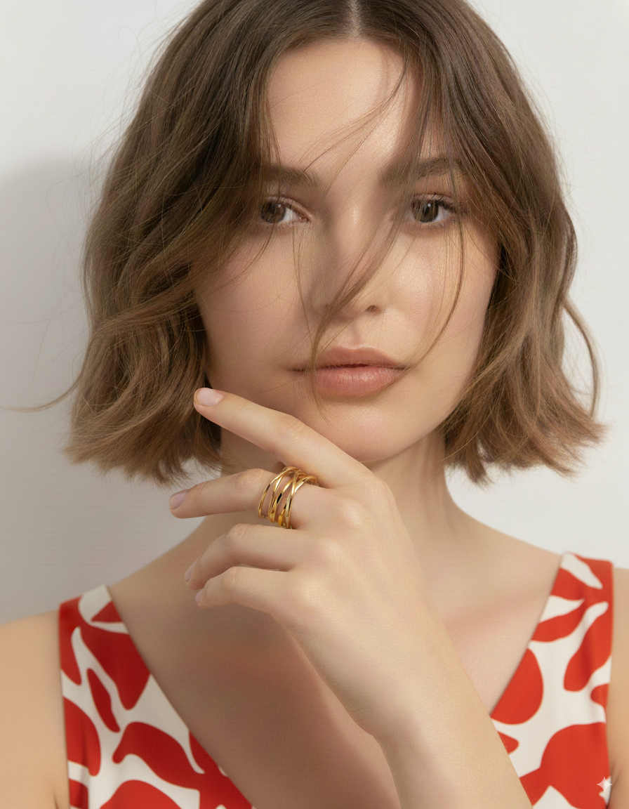 Sleek and refined, this layered criss-cross statement ring embodies contemporary elegance with its fluid, airy lines. An effortless piece that exudes confidence and everyday sophistication.