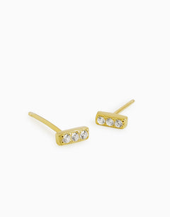 How adorable! Seen here is a pair of mini dainty bar earrings that have been inlaid with shimmering crystal details. Made of 14K gold plated 925 sterling silver.