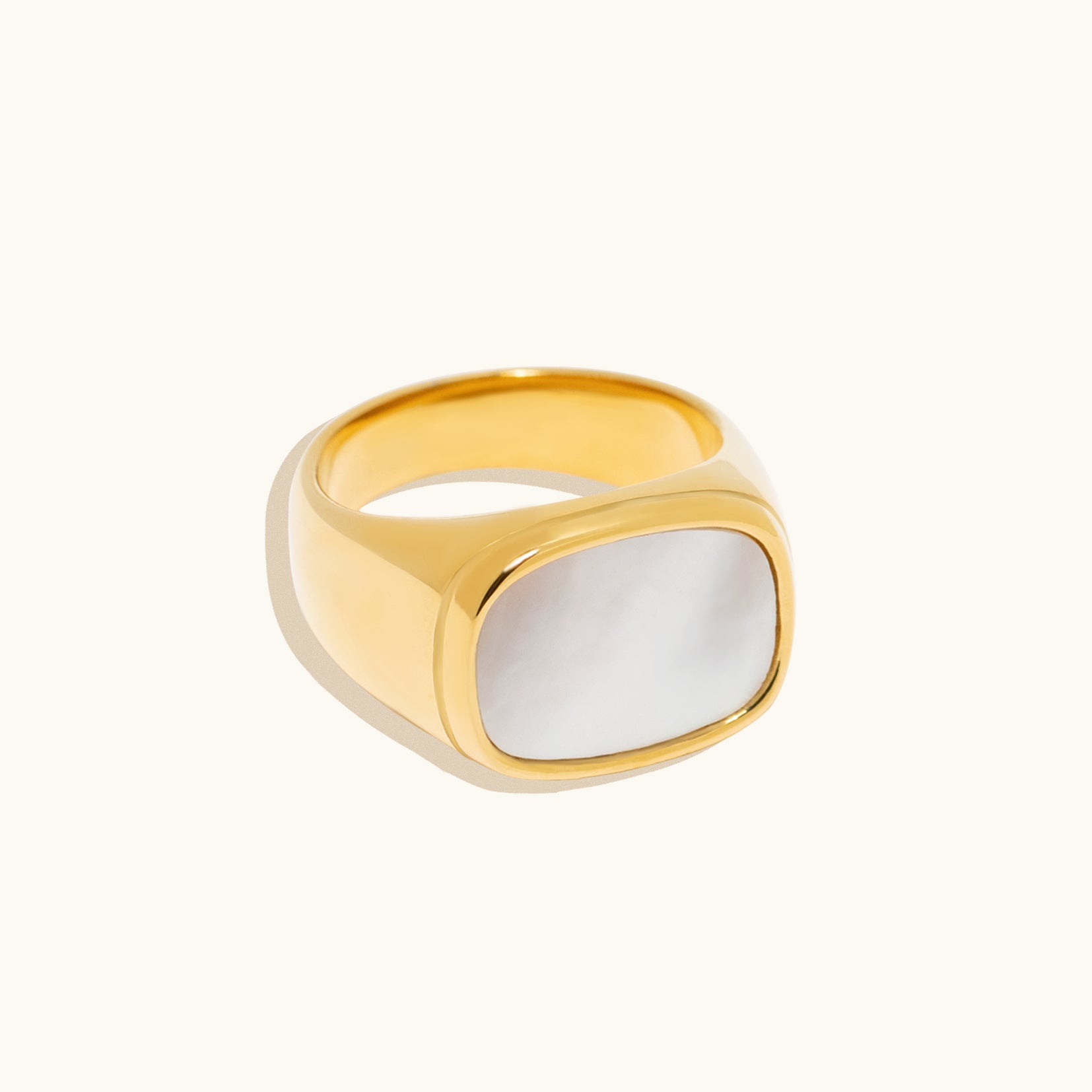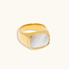 This White Mother of Pearl Signet Ring reimagines a timeless classic with a modern twist, seamlessly blending heritage and contemporary elegance in a high-gloss 18K gold finish.
