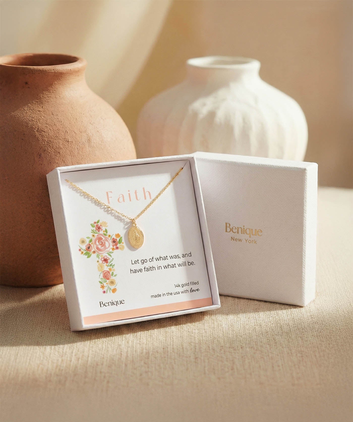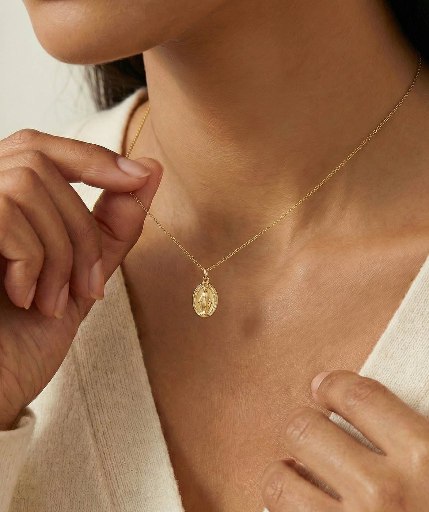 This dainty everyday necklace featuring a small oval pendant with embossed Virgin Mary and Inscription around the border: “O Mary, conceived without sin, pray for us who have recourse to thee”. It comes with an inspirational jewelry card: “Let go of what was, and have faith in what will be.”